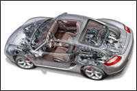 The 2006 Cayman S is motivated by the same engine as the Boxster S but with a greater displacement -- 3.4 liters. For 2007, both share the same powertrain. Output is rated at 295 horsepower and 255 foot-pounds of torque. The engine purrs or roars depending on the