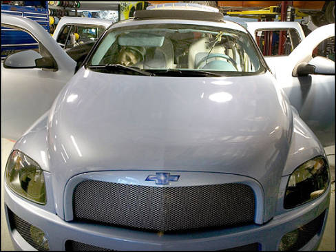 Chevy's HHR hasn't even hit the show stand yet and a California chop shop has modified it, prior to displaying it at the 2005 Greater Los Angeles Auto Show later this week. West Coast Customs, the customizer that is regularly featured on MTV's "Pimp My Ride", has done the dirty work, chopping the roof, adding roll pans, a unique front fascia with blacked-out mesh grilles, massive multi-spoke rims and low-profile rubber.