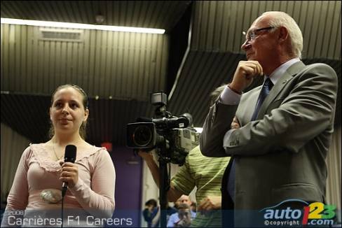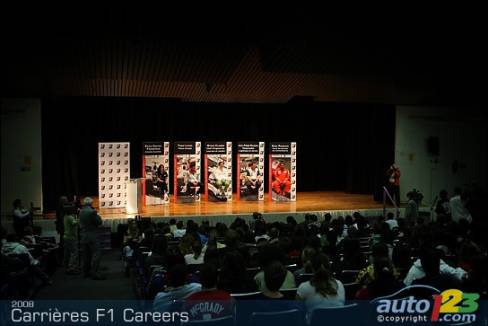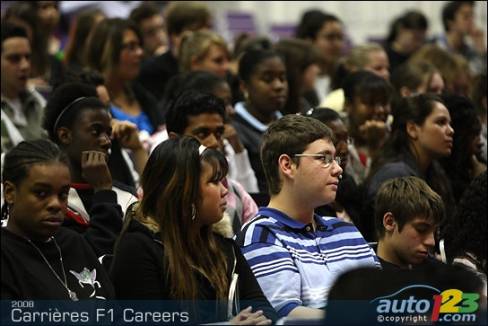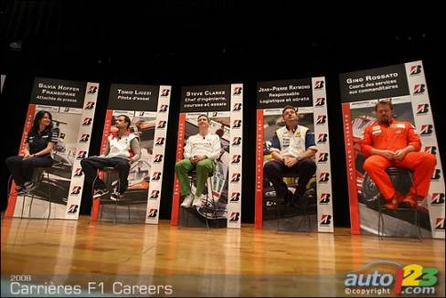 As part of the activities surrounding the 2008 Canadian Grand Prix in Montreal, five F1 representatives took a few hours out of their busy schedules to meet high school students. Tonio Liuzzi, test driver for Force India F1 team, Steve Clark, Race and Test Chief Engineer for Honda Racing F1 Team, Jean-Pierre Raymond, Safety and Logistics Director for ING Renault F1 Team, Silvia Hoffer Frangipane, Media Attaché for AT&T Williams, and Gino Rossato, Coordinator of Sponsor Services for Scuderia Ferrari Malboro, were available to answer questions from students.