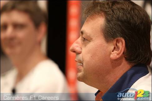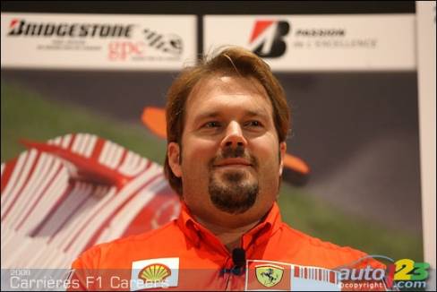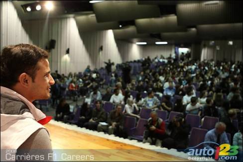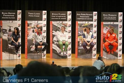 As part of the activities surrounding the 2008 Canadian Grand Prix in Montreal, five F1 representatives took a few hours out of their busy schedules to meet high school students. Tonio Liuzzi, test driver for Force India F1 team, Steve Clark, Race and Test Chief Engineer for Honda Racing F1 Team, Jean-Pierre Raymond, Safety and Logistics Director for ING Renault F1 Team, Silvia Hoffer Frangipane, Media Attaché for AT&T Williams, and Gino Rossato, Coordinator of Sponsor Services for Scuderia Ferrari Malboro, were available to answer questions from students.