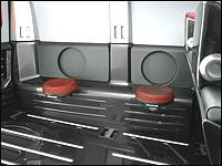 Remember I said it wasn't practical? Just one look at the flip down seat pods affixed to the cargo area walls will tell you that the novelty with the kids would wear out pretty quickly with this one. The remainder of the cargo area was inspired by cargo plane interiors, being made up of a hard plastic base and aluminum rails. This would benefit users who want to load on large, cumbersome items such as external audio monitors.