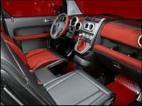 The addition of a front bench seat with driver's side bolsters, covered in both a black nylon material and red alcantera suede, is a good idea but its center lower cushion is too short to make the addition of a third person possible - three's a crowd anyway, right? What is practical are the Studio E's built-in front passenger-side rubber floormats with raised diamond cleats to benefit traction. Following the stylish red, black and silver interior motif the gauge cluster features red lettering against a black background surrounded in aluminum-look rims.