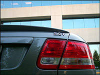 At the rearmost tip of the trunklid is a very subtle spoiler, applying a modicum of downforce while at the same time sprucing up the 9-3's exterior styling. Other aerodynamic add-ons include a front lip spoiler, rocker panel effects and a rear diffuser-style valance. The door handles are matt-black, odd that they're not color-keyed considering the Vector's highest level of trim, but maybe due to a certain sporty styling effect Saab is going after. The lack of paint certainly hasn't negatively affected the 9-3 Vector's coefficient of drag though, a slippery 0.29 Cd.