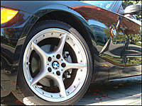 handling ability. There isn't much that beats the gleeful delight found in sitting just fore of a rear axle, piloting the long nose of an unflappable roadster through a series of twists and turns tighter than a Hitchcock drama. Accentuated by the smallish diameter of the steering wheel and its perfect, ergonomic shape, Z4 turn-in is immediate. Body lean in the Bimmer roadster is pretty much nonexistent, regardless of speed, even when the 18-inch low-profile Bridgestone Potenzas laid down a wide patch of sticky contact beneath the car and never lost traction or cried out in tire-screeching pain, despite the application of severe cornering punishment. These brave "soles" were attached to spectacularly good-looking, 5-spoke BMW alloy rims.