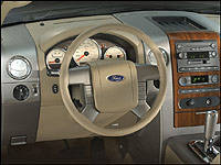| For its latest iteration of the F-Series pickup truck, Ford has pulled out the stops to create five unique interiors for different market segments. The Lariat interior shown here has finely stitched leather surfaces, brushed aluminum features and wood grain. Note the center console and floor shifter that is available when captain's chairs are ordered for the front seat. (Photo: Ford Motor Company) |
