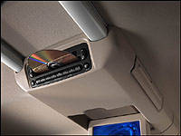 | The 2004 Ford F-150 will be the first vehicle to feature this overhead rail system produced by auto supplier Johnson Controls Inc. The brushed aluminum rails have an integral power supply, allowing the buyer to purchase various optional modules, like the DVD player and fold-down LCD screen shown here, and pop them into the vehicle. (Photo: Ford Motor Company) |