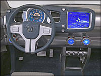 | Honda was coy about the interior features of its concept vehicle, but this photo clearly shows a large, electronic speedometer behind the three-spoke steering wheel; a large touch-point liquid crystal display screen, probably for controlling the navigation system, climate control, entertainment, and communications; and large knobs to handle the dual climate control system. (Photo: Honda Canada) |