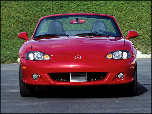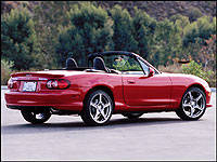 higher than the windshield. When the top was down he arrived wherever we were going with a new hairstyle. With the top up, he had to duck because his head would hit the roof. When he sat in the driver's seat his legs were squished up to the steering wheel, and because the car doesn't include tilt steering the Miata would be very difficult for him to drive. Oh well, that just meant more MazdaSpeed Miata for me! It's hard to describe near perfection in a convertible under $35,000, but if I had to spell it, it would read MazdaSpeed MX-5 Miata.