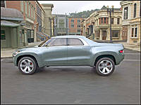 A sleek set of integrated ellipsoid projector headlamp clusters featuring neon turn lamps in floating bezels, round out the front of the swollen front fenders, the latter of which match the truck's sculpted hood. These last two design cues might pay greater homage to the previous Dakota than Dodge's recently unveiled 2005 version, but the similarity ends there.