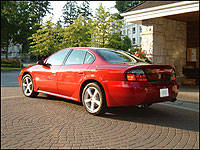 dampers and an anti-roll bar, plus rear semi-trailing arms managed by coil springs, complemented by an anti-roll bar and an automatic self-leveling system. In addition to competent handling characteristics, the folks at Pontiac ensured that excessive road noise would be off-limits in a Bonneville. Five layers of insulating materials and 22-noise blockers are used to prevent noise from intruding into the cabin, although wind-rush becomes evident at highway speeds - perhaps accentuated by the quiet of everything else. With a curb weight of 1,719 kilos (3,790 lbs) the GXP requires strong brakes to be a contender in the performance car category, and it has them in the way of 14-inch rotors up front and 13-inch rotors working the rear. The upgraded 4-wheel antilock disc brakes on the GXP repeatedly pulled in quick, easily controlled, fade-free stops. Pedal actuation was good, holding no surprises. It seemed the only encumbrance to shorter stops was the grip, or lack thereof, delivered by the P235/50R18 Goodyear Eagle mud and snow radials.