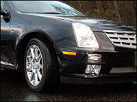 button would enable quick selection of either "touring" or "performance" suspension modes to match immediate needs. The large-for-a-mid-size STS is a pleasure to push hard through the curvy stuff, although I would prefer a little more steering feedback and slightly greater on-center feel. I often found it necessary to apply a slight tug to pull the wheel back to center after completing a turn. However, for a long-hooded luxo-cruiser, turn-in is sure-footed and rapid thanks to the optional sport-tuned suspension system and the STS Handling Package, both of which conspired to keep my tester nailed to the tarmac.