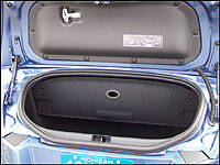 Crossfire's side strakes. While the luggage is standard, Chrysler offers a stylish humidor that fits neatly into the center console. The automaker reports more Crossfire branded merchandise is on the way. That trunk features a fold-down separator for when the top is lowered, leaving enough space underneath for a couple of briefcases on their sides with more room closer to the rear for a large carry-on suitcase and a few smaller bags. Technically speaking, the trunk allows for 104-liters (3.6 cubic feet) with the top down, and if the top is up a total of 190-liters (6.5 cubic feet).
