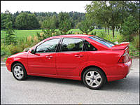 the combination of the same front struts and rear shocks used on the European Focus ST170 and the 2004 Focus SVT, making the setup 50 percent stiffer than that used with the SE and SES suspensions. I found the sport-tuned suspension to be a good balance of ride comfort and handling prowess, sporty enough without the need to feel each and every the pebble on the road. Also helping the handling is a hot set of Pirelli P205/50R16 all-season radials wrapped over 16-inch aluminum alloy wheels. These accompany a solid set of 4-wheel disc brakes with ABS, which performed all they were asked to do during a particularly soggy summer week flawlessly. What wasn't so hot about the Focus however, was the interior. Although the 2005 models pride themselves on a new and improved instrument panel, I was not impressed.First off, the two-tone black plastic and imitation carbon-fiber trim didn't flow that well. I was also confused as to why the placement of the cigarette lighter was directly beside the volume control of the optional 6-disc in-dash stereo system. Often when I reached to turn the tunes up or down, I ended up turning the cig lighter. I am sure Ford could have found a better place for this