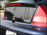 When called upon, the electric motor instantly and seamlessly kicks in, providing a constant electrical surge, made known to the driver only by a visual display on the dashboard. Unlike a turbo or supercharger, the electric motor's presence is nearly invisible - there's no whine or odd vibrations - you just go. Since the gasoline and electric motors have different peak power ratings, Honda has rated the Insight at 73-horsepower and 91 lb-ft of torque, which surprisingly is enough to spin the tires in first gear, leaving metre-long bicycle-sized treads on the ground, which are bound to confuse those who pay attention to skid marks on the street.