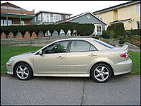 even my taller male friends. If shotgun (the front passenger seat for those born yesterday or not familiar with North American colloquialisms) is taken, their next spot of choice is always behind me being that I am not that tall and therefore sit close to the steering wheel. Headroom is also ample, at least enough to keep the 6-foot 2-inch friends happy. Visibility was great out the front and sides but a little trickier out the rear. The 6 sports a rear spoiler that didn't necessarily 'spoil' my sightline out the rear window, but didn't help it either. The rear decklid is moderately high and the angle of the rear glass is quite steep, making for a narrower than average window area. Nevertheless, I was still able to parallel park and back up with little angst.
