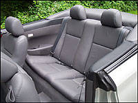extremely difficult to drop the top without bending and stretching over the center console, if your body so permits, or getting out and unclipping it from the passenger's seat. In other words, the convenience of not being able to retract the softtop at an intersection negates its speedy power mechanism. What's even clumsier is the massive, plastic tonneau cover. Modern day convertibles are mostly doing away with such inconveniences, as owners tend not to be bothered with them resulting premature wear of exposed mechanical hardware. When the top is up the tonneau takes up half of the trunk, and when down it ended up consuming the entire rear seat, as I got frustrated trying to snap it into place and left it back there. Needless to say, while the top looks to be well made its operation is anything but convenient.