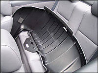 room is pretty decent back there too, a commodity that is usually severely compromised in this class of car. The trunk is also quite large for a convertible, with a full-size alloy spare hidden under the cargo floor as standard equipment. Incidentally, Toyota has added a new tire pressure warning system as well. Oh yeah, I almost forgot about the most important aspect of this model, its convertible top. It's nicely lined fabric top with excellent insulation and a defog-equipped glass rear window. The top lowers and rises quickly, but I can't say I was impressed with the latching mechanisms. Unlike the majority of luxury convertibles that either feature fully automatic operation or the need to twist and pull a centrally-mounted lever, the Solara incorporates two levers on either side of the windshield surround. This means it's
