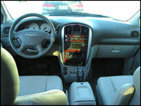 The dashboard pretty much resembles a Caravan's but has its own unique touches, such as convincing fake wood and silver accents. You've got a tri-zone climate control system to keep everyone happy. The 6-disc changer can read just about anything: Audio CDs, MP3 CDs, DVD movies and audio DVDs. There are controls mounted on the back of the steering wheel spokes and help you keep your eyes on the road. My tester was equipped with an optional $450 glass sunroof, which eliminates an overhead storage system on rails that's otherwise standard equipment. Hey--there's no backup camera, a feature that's found in the Odyssey Touring and Quest 3.5 SE. There is a backup sensor, though, so I guess that's enough.