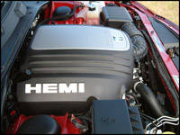 My HEMI-powered R/T tester galloped with the strength of 340 horses supplied by a 5.7-litre (348 cubic inch) V8. Like the early Chargers, its massive power is delivered to the rear wheels. Unlike the golden oldies though, today's HEMI is connected to a sophisticated five-speed autobox featuring DaimlerChrysler's AutoStick manual-mode shift capability. The additional cogs take better advantage of the torque generated by the new V8, which hits a staggering 390 foot-pounds at 4,000 rpm. Also better is the new HEMI's improved fuel economy and reduced emissions output thanks to DaimlerChrysler's Multi-Displacement System (MDS), which deactivates four of the eight cylinders during phases of low power demand such as when cruising.