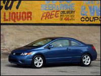 a 2006 Civic Coupe is dressed, its pleasing combination of economy, sport and practicality unite in making it a sure-fire winner. Seldom have I had so many people gush over a test vehicle, and certainly not over an entry-level economy car. Yet this little slingshot catches attention from young and old alike, with all of them surprised to learn it's a base model Honda Civic. The dramatic styling and futuristic interior of Honda's sleek Civic Coupe contradicts its competitive, econo-car pricing, and that alone ought to ensure the vehicle's popularity. Add Honda's reputation for reliability and driving fun to the formula and I doubt the Japanese brand will feel much of a competitive pinch from GM's new coupes, the Chevy Cobalt, Pontiac Pursuit and Saturn Quad Ion.
