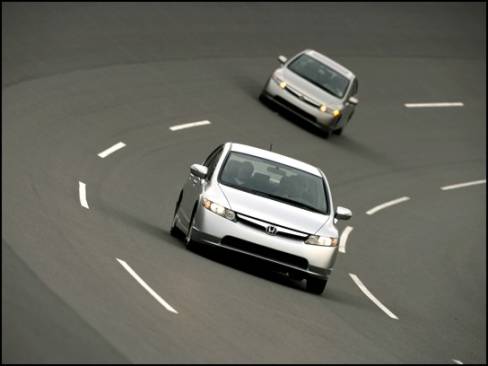 radical. In the same way that the new Civic's exterior panels cause onlookers to think differently about the updated model, its interior also looks far into the future. The IMA gauges are nestled into the lower portion of the Civic's two-tier instrument cluster, next to the oversized tach, while the upper shelf holds the digital speedometer and other vital info systems.