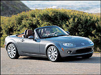 Twin cannon-style exhaust pipes and new 17-inch alloy wheels with 205/45 sport tires give the impression that the new car is stronger, leaner and faster than ever. Mazda has also revised the soft-top folding roof mechanism to include a glass rear window and a single-clasp latch for one-handed operation. Mind you, these details have all been grafted onto a body which closely follows the original proportions of the MX-5, a two-seat convertible that balances engine, drivetrain and passengers without wasting space.