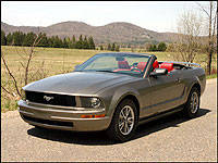 track event in la belle province on a warm spring day recently, and despite roads that appeared to have previously suffered through a cruise missile offensive it responded with grace and composure. The first car at my disposal was a nicely upgraded V6 model, sporting a conservative coat of gray metallic paint and a rather spicy hot-red leather interior - call it the Belinda Stronach edition. Unlike Ms. Stronach, however, the sporty Mustang convertible managed to keep going in the same direction when opportunistic winding roads lay ahead, never once threatening me with a twitchy rear end when pushing the handling envelope.