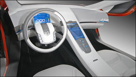 Instead of a conventional dashboard, the steering wheel, steering column and instruments are treated as a single, self-sufficient entity. The steering wheel features two vertical spokes set close together, leaving 80% of the rim free for optimum visibility. A thin blue touch screen is placed directly before the driver, inside the steering wheel hub.