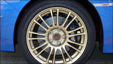 | The golden alloy wheels and Rally Blue paint are once again a trademark of the STI. |