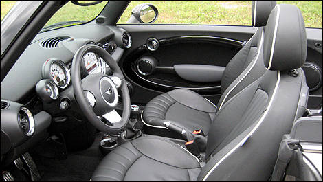 On the outside, the John Cooper Works treatment is actually pretty subtle compared to a Cooper S. The car gets red-painted brake calipers, exclusive 17-inch lightweight alloy wheels, and JCW badging front and rear. That’s about it. By the way, this year’s redesign of the convertible eliminates the ungainly, exposed trunk hinges.