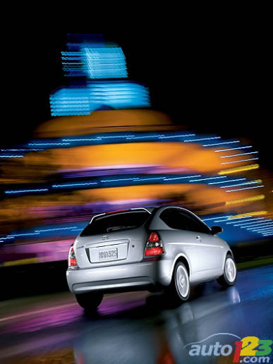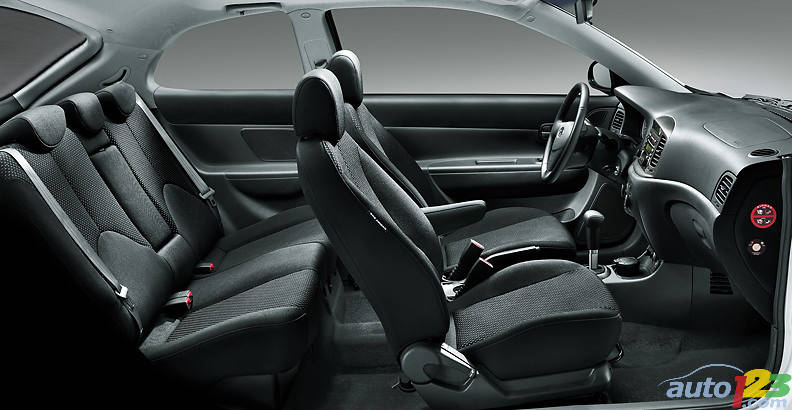 Chrome and body-colored trim convey a more upscale appearance than the price lets on, and a tall roofline emphasizes the interior capacity. In fact, total interior volume measures 2,962 litres, with cargo capacity rated at 351 litres. That’s enough to put the Accent above most competitors.