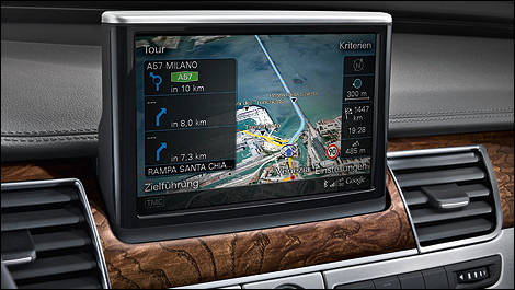 The new A8 has set the bar at new heights with regard to multimedia technology. Its multimedia interface (MMI) navigation plus features among other innovations, a highly evolved operating concept incorporating a touchpad – known as MMI touch. Also included are an integrated hard disk for navigation, phone and audio data and a graphics processor capable of generating high-quality, three dimensional images. The MMI analyzes navigation data predictively, relaying information to the control units managing the automatic cruise control with Stop & Go, adaptive lights and the 8-speed tiptronic gearbox so that these systems can precisely adapt their function to conditions well in advance.