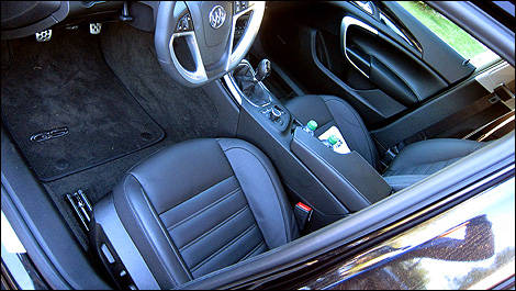 Inside, there are GS-monogrammed floor mats, a grippy flat-bottomed wheel, and… a six-speed manual gear shift. That's right. The Regal GS is only available with a manual gearbox. An automatic will be introduced early next year, but GM still estimates that sales should be 50/50.