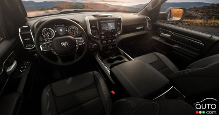 The upgrades aren't just cosmetic. The truck rides on a one-inch factory lift with heavy-duty shocks, rolling on 18-inch black wheels wrapped in 32-inch all-terrain tires. Ram has also equipped the vehicle with a comprehensive armour package. Skid plates protect the front end, steering rack, transfer case and fuel tank.