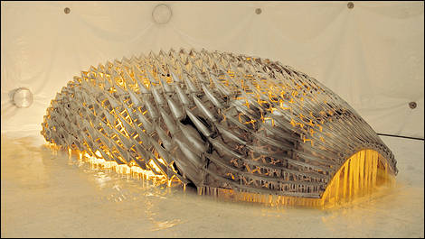 Eliasson’s project transforms an object of advanced industrial design into a work of art that critically and poetically reflects on the relationship between global warming and the automotive industry. The BMW H2R race car, a hydrogen-powered vehicle, was developed to attain speed records while pursuing a sustainable future based on the use of regenerative fuel. Eliasson has removed the car’s outer shell and replaced it with a complex, translucent skin made of steel mesh, reflective steel panels, and many layers of ice.