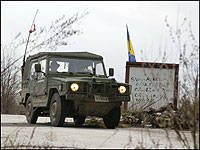 | Members of the 1st Battalion Princess Patricia's Canadian Light Infantry (1 PPCLI) Battle Group, based out of Camp Courcelette in Bihac, Bosnia-Herzegovina, are seen conducting "presence patrols" in an Iltis light utility vehicle near the Croatian border at an abandoned airfield in November of 2002. (Photo: MCpl Paul MacGregor Canadian Forces Combat Camera, Department of National Defence) |