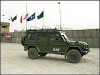 | A Canadian Forces' G-Wagon passes by the main entrance to Camp Julien, in Kabul, Afghanistan in March of 2004. (Photo: Cpl Chris Connolly, Op Athena Roto 1, Department of National Defence) |