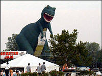 | Right out of a B-movie was a 12-story inflatable Tyrannosaurus Rex adorned with environmentalist slogans, setup by the few protesters on hand. (Photo: Joseph Cabadas, Canadian Auto Press) |