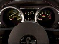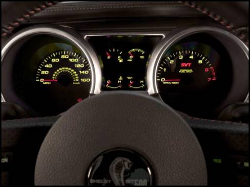 The Shelby GT500 script and Cobra image are repeated on the steering wheel cap. Behind the wheel are titanium-faced gauges swapped in location so that the tachometer is dominant visually for the driver. The chrome accessories inside the cabin have been replaced with a satin aluminum finish, including the aluminum shift lever knob that is nicely positioned for quick, positive shifts of the six-speed transmission.