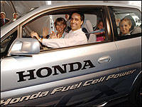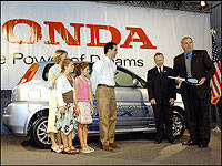 | Senior Vice President of American Honda Motor Co., Inc, John Mendel, right, presents a symbolic key to the Spallino family for their 2005 Honda FCX, an advanced hydrogen-powered fuel cell vehicle, during a news conference introducing the vehicle, Wednesday, June 29, 2005 in Los Angeles. (Photo: American Honda) |