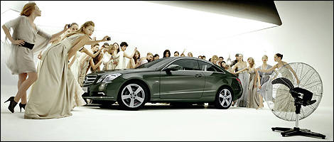 "Elegance and style - that is the connection between Mercedes-Benz design and top-class fashion design. Since sporty Coupés embody a particularly elegant and expressive design, in our key visual we have shot the new E-Class Coupé together with top model Julia Stegner and additional protagonists", saysAnders Sundt Jensen, Vice President Brand Communications Mercedes-Benz Cars. "The key visual will be further used in a webspecial, which also focuses on the attractive design of the E-Class Coupé, and is thus a component of our integrated marketing campaign." The Mercedes-Benz E-Class Coupé, which will be launched on May 9, 2009, sets new standards in design and efficiency within its market segment. With significantly reduced fuel consumption and an athletic and powerful design, the Coupé combines driving pleasure, comfort and emotionality.