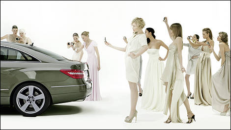 Irresistible fascination and sensual elegance: The official key visual for the upcoming Mercedes-Benz Fashion Week Berlin Spring/Summer 2010 presents the new E-Class Coupé of the Stuttgart-based car manufacturer as an object of desire. International star photographer Peter Lindbergh has created an impressive work of art that perfectly expresses the attraction of beauty and elegance - and thus the connection between fashion and Mercedes-Benz design. The leading role in the key visual is played by the international Mercedes-Benz fashion brand-ambassador Julia Stegner and the new E-Class Coupé. They are both surrounded by five additional women who are fascinated by the design of the new E-Class Coupé. Julia Stegner and the other protagonists are wearing exclusive evening dresses by Escada. The key visual also serves as an entry to an interactive webspecial on the E-Class Coupé.