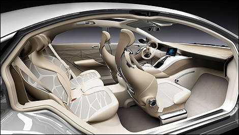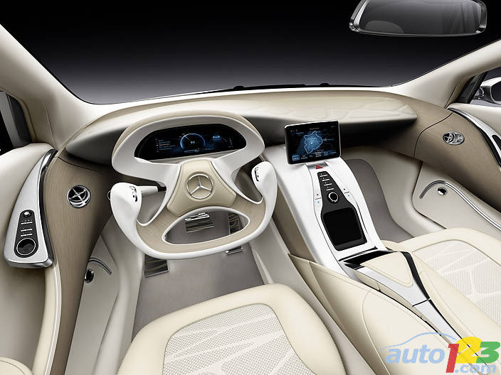 Precious wood surfaces and lots of light ensure a high level of comfort in the interior of the F 800 Style. Occupants will immediately notice the modern sense of lightness, and functional elements such as the driver area and the door armrests seem to float in space like sculptures. The innovative lightweight-construction seats in the F 800 Style consist of a magnesium shell and a carbon fiber laminate seatback across which a fine yet resistant netting is stretched. The seat shell also features genuine wood veneer. For the wood veneer process, Mercedes-Benz engineers used a 3D surface coating procedure designed especially for the veneering of three-dimensional surfaces. This same procedure was used to create the wood finishing in the center console, on the doors, and in the driver area. These wood finishing pieces are molded as 3D laminated components and are augmented by an aluminum core, which ensures that the components meet the high crash safety standards that are a hallmark of Mercedes.