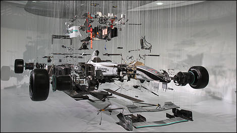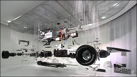 Each of the 3,200 parts on display has been purpose-designed for F1 racing. Comprising over 90,000 man-hours of design time, over 200,000 man-hours of manufacturing and utilising carbon fibre, titanium, aluminium and magnesium, a 2010 F1 car weighed little more than 620 kg.
