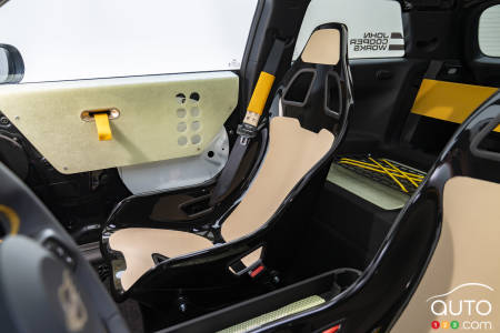 The cabin design is very minimalist. The bucket seats are covered in a water-repellent neoprene material, ideal for welcoming damp occupants fresh out of the water. Mini has also equipped The Skeg with fiberglass trays for storing wetsuits, and the doors and dashboard feature sporty fiberglass panels.