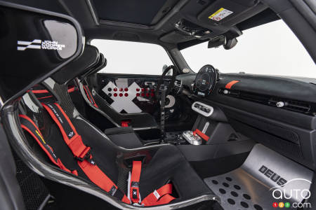 Inside, the red, white and black theme is repeated, with five-point racing harnesses and race-inspired bucket seats. There are also aluminum floor plates, stripped-down door panels, a roll cage and a button-less steering wheel.