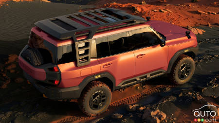 The concept features a “Modern Robust” design language, characterized by a vertical front end, short overhangs for better approach angles, and a distinctive lighting signature with rectangular LEDs. Rugged touches abound: integrated skid plates, orange recovery hooks, a futuristic roof rack with auxiliary projectors, and an exposed spare tire on the rear gate.