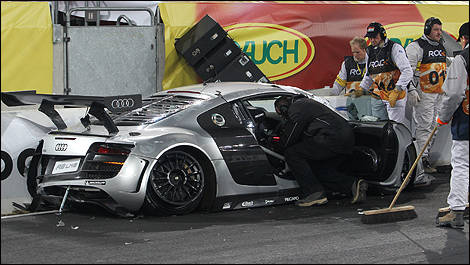 After clipping a wall, the Lotus driver crashed at the start of the Race of Champions evening in Dusseldorf when the throttle of his Audi R8 stuck open.