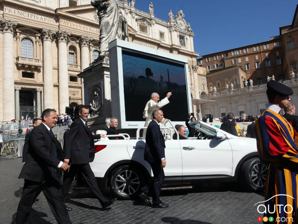 Topless Hyundai Santa Fe becomes newest Popemobile True to his simple lifestyle, Pope Francis is now driving around in a new Popemobile, namely a topless Hyundai Santa Fe with no clear protective barrier so His Holiness can remain accessible.