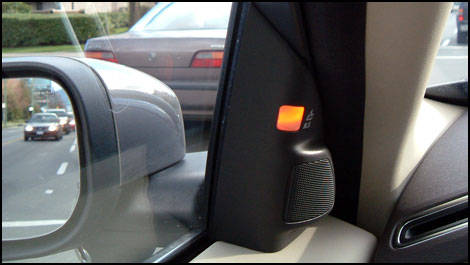 Without an explanation of Volvo's BLIS (Blind Spot Information System), occupants would surely wonder what triggers an orange light located at the base of each A-pillar to illuminate in an apparent random fashion. The lights indicate to the driver, the presence of a vehicle in the Volvo's blind spot on either side of the vehicle. With a lens mounted beneath each side-view mirror, the system uses digital camera technology to spot vehicles travelling alongside the Volvo or rapidly approaching from behind. During daytime driving, the digital processor examines the camera's image for objects matching the shape of such vehicles. At night, the technology looks for headlight patterns to identify these threats.